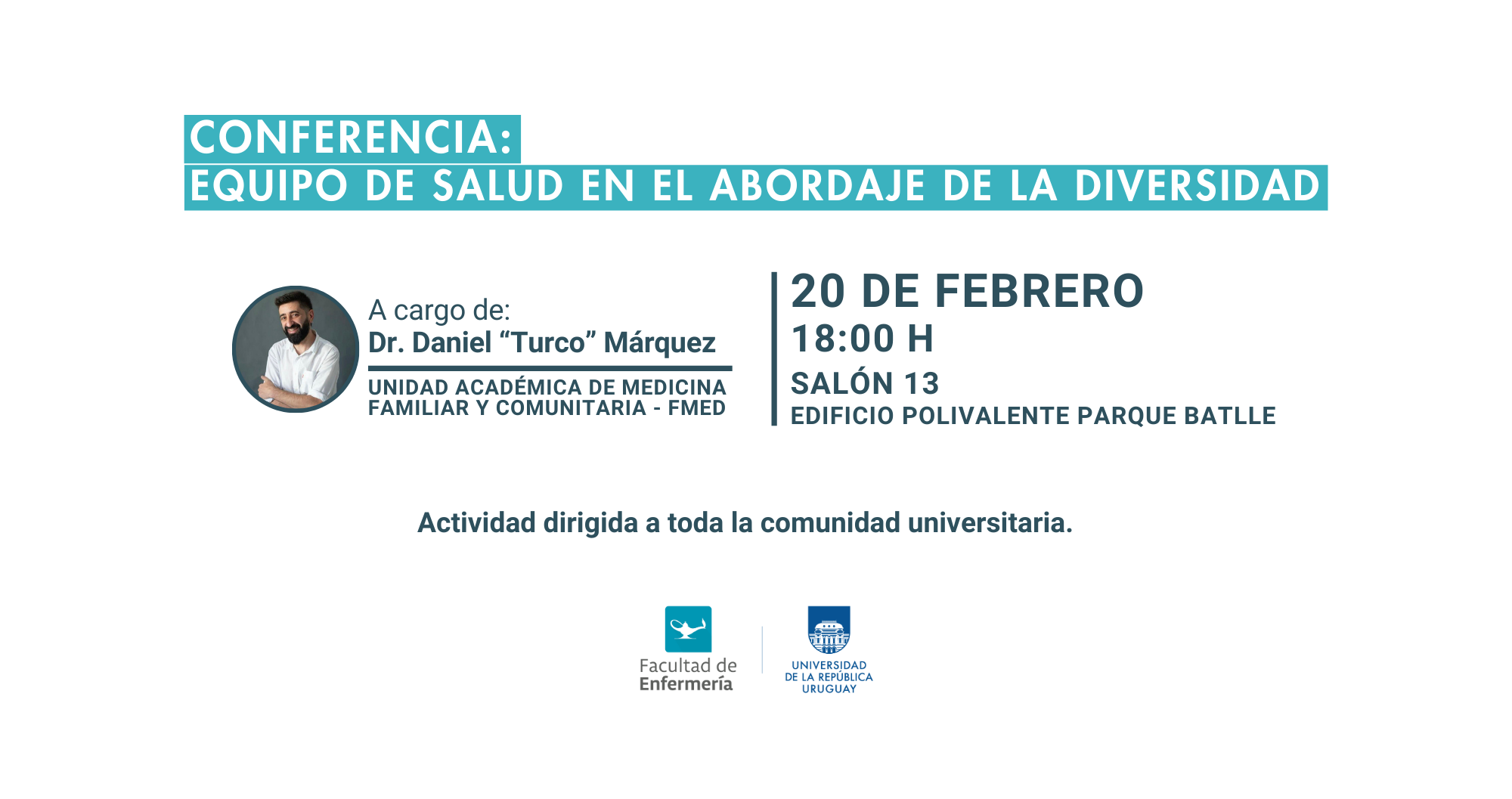Se desarrollará la conferencia denominada: «Equipo de salud en el abordaje de la diversidad», a cargo del Dr. Daniel “Turco” Márquez, en el Edificio Polivalente Parque Batlle. Esta instancia es organizada por la