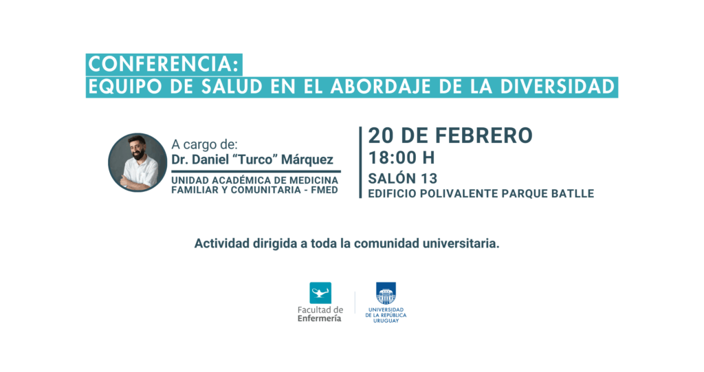 Se desarrollará la conferencia denominada: «Equipo de salud en el abordaje de la diversidad», a cargo del Dr. Daniel “Turco” Márquez, en el Edificio Polivalente Parque Batlle.