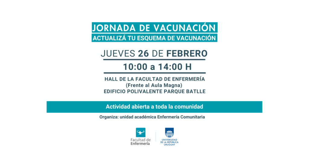 El próximo jueves 26 de febrero, se realizará una jornada de vacunación abierta, en el horario comprendido entre las 10:00 y las 14:00 horas, en el hall frente al Aula Magna, en el Edificio Polivalente Parque Batlle.